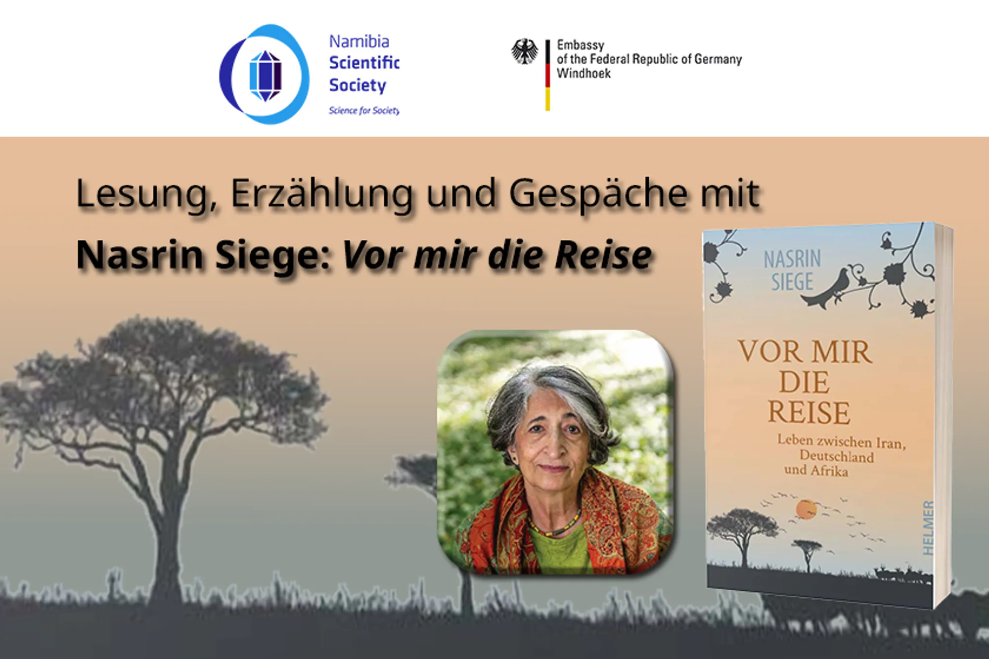 Die Namibia Scientific Society und die Deutsche Botschaft Windhoek laden zu einer Lesung mit Nasrin Siege ein.