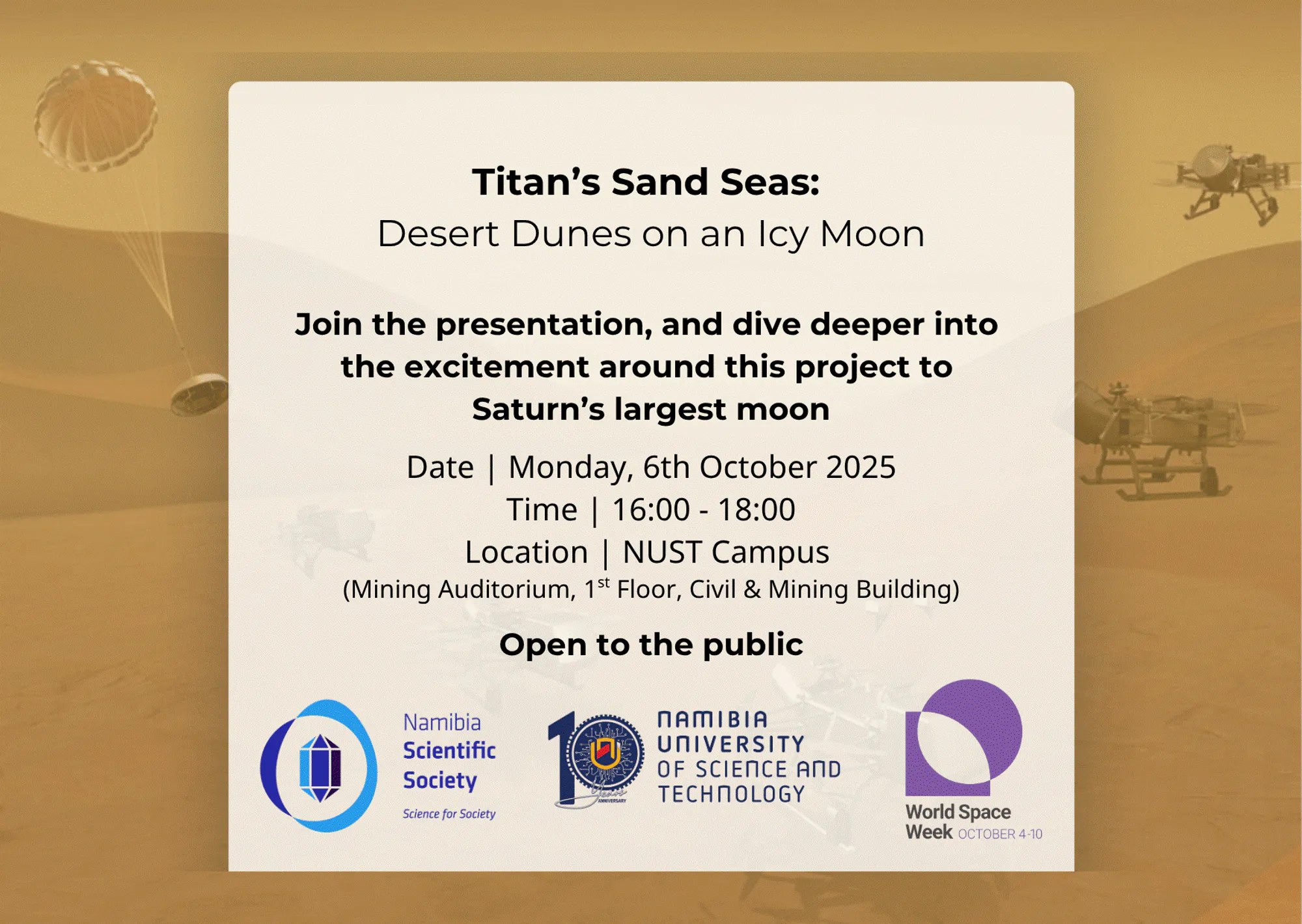 The Namibia Scientific Society in collaboration with AMT, NUST and NCRST will host a presentation featuring insights into an exciting upcoming space mission — the Dragonfly Mission to Titan, Saturn’s largest moon.