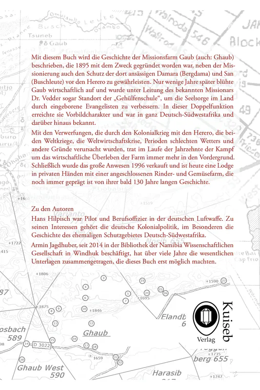Mit diesem Buch wird die Geschichte der Missionsfarm Gaub (auch: Ghaub) beschrieben, die 1895 mit dem Zweck gegründet worden war, neben der Missionierung auch den Schutz der dort ansässigen Damara (Bergdama) und San (Buschleute) vor den Herero zu gewährleisten. Nur wenige Jahre später blühte Gaub wirtschaftlich auf und wurde unter Leitung des bekannten Missionars Dr. Vedder sogar Standort der „Gehülfenschule“, um die Seelsorge im Land durch eingeborene Evangelisten zu verbessern. In dieser Doppelfunktion erreichte sie Vorbildcharakter und war in ganz Deutsch-Südwestafrika und darüber hinaus bekannt.