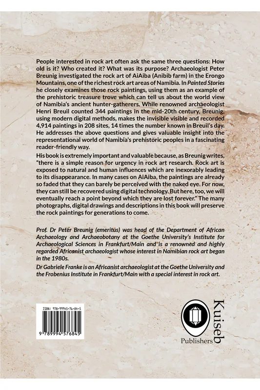 People interested in rock art often ask the same three questions: How old is it? Who created it? What was its purpose? Archaeologist Peter Breunig investigated the rock art of AiAiba (Anibib farm) in the Erongo Mountains, one of the richest rock art areas of Namibia. In Painted Stories he closely examines those rock paintings, using them as an example of the prehistoric treasure trove which can tell us about the world view of Namibia’s ancient hunter-gatherers. While renowned archaeologist Henri Breuil counted 344 paintings in the mid-20th century, Breunig, using modern digital methods, makes the invisible visible and recorded 4,914 paintings in 208 sites, 14 times the number known in Breuil’s day. He addresses the above questions and gives valuable insight into the representational world of Namibia’s prehistoric peoples in a fascinating reader-friendly way.