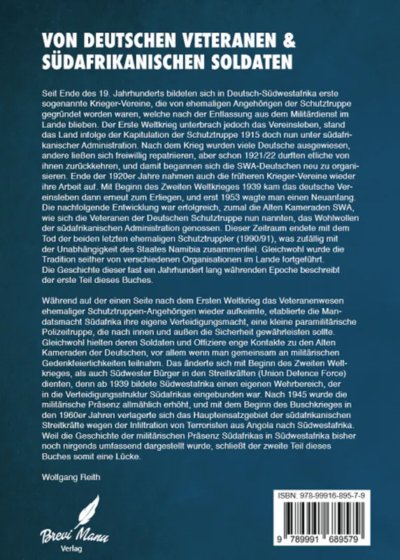 Seit Ende des 19. Jahrhunderts bildeten sich in Deutsch-Südwestafrika erste sogenannte Kriegervereine, die von ehemaligen Angehörigen der Schutztruppe gegründet worden waren, welche nach der Entlassung aus dem Militärdienst im Lande blieben. Der Erste Weltkrieg unterbrach jedoch das Vereinsleben, stand das Land infolge der Kapitulation der Schutztruppe 1915 doch nun unter südafrikanischer Administration. Nach dem Krieg wurden viele Deutsche ausgewiesen, andere ließen sich freiwillig repatriieren, aber schon 1921/22 durften etliche von ihnen zurückkehren, und damit begannen sich die SWA-Deutschen neu zu organisieren. Ende der 1920er Jahre nahmen auch die früheren Kriegervereine wieder ihre Arbeit auf. Mit Beginn des Zweiten Weltkrieges 1939 kam das deutsche Vereinsleben dann erneut zum Erliegen. Die weitere Entwicklung war erfolgreich, zumal die „Alten Kameraden SWA“, wie sich die Veteranen der Deutschen Schutztruppe nun nannten, das Wohlwollen der südafrikanischen Administration genossen. Dieser Zeitraum endete mit der Unabhängigkeit des Staates Namibia. Gleichwohl wurde die Tradition seither von verschiedenen Organisationen im Lande fortgeführt. Die Geschichte dieser fast ein Jahrhundert lang währenden Epoche beschreibt der erste Teil dieses Buches.